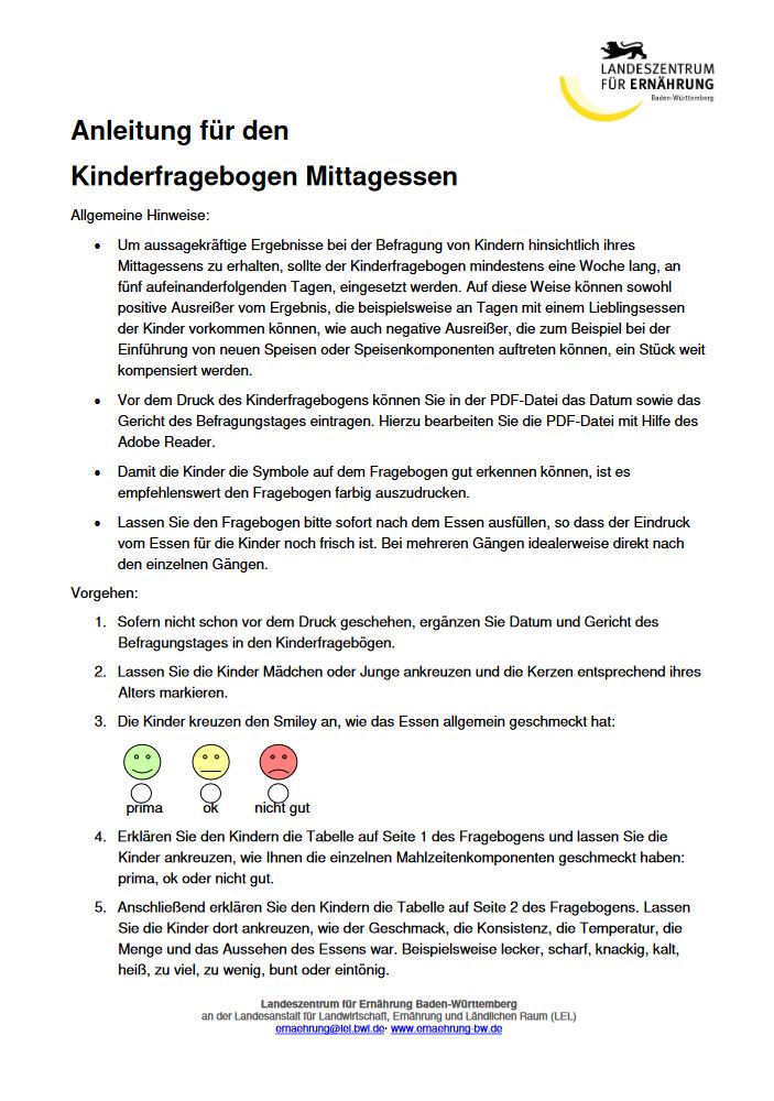 Anleitung für den Kinderfragebogen Mittagessen