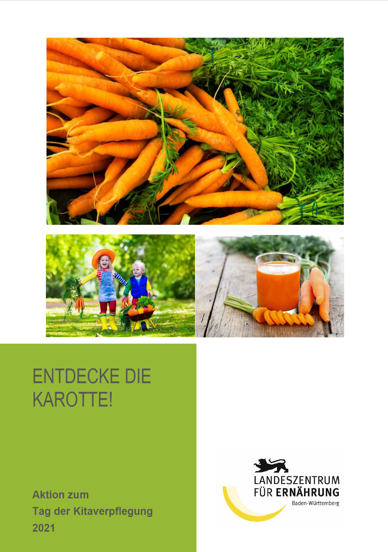 Die Broschüre richtet sich an pädagogische Fachkräfte und Kindertagespflegepersonen. Sie enthält Mitmach-Aktionen und Rezepte rund um die Karotte.