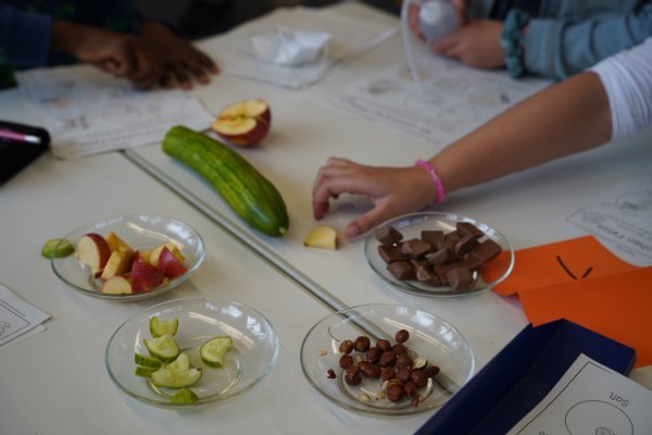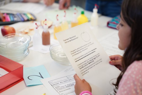 Das Forscherinnen- und Forscherlabor ist ein Ort, an dem Naturwissenschaften mit dem Alltag verknüpft werden. Die Grundschulkinder untersuchten dort mit einfachen Mitteln den Fettgehalt von Lebensmitteln, trainierten ihre Geruchssinne und gingen der Bräunung von Äpfeln auf den Grund.
