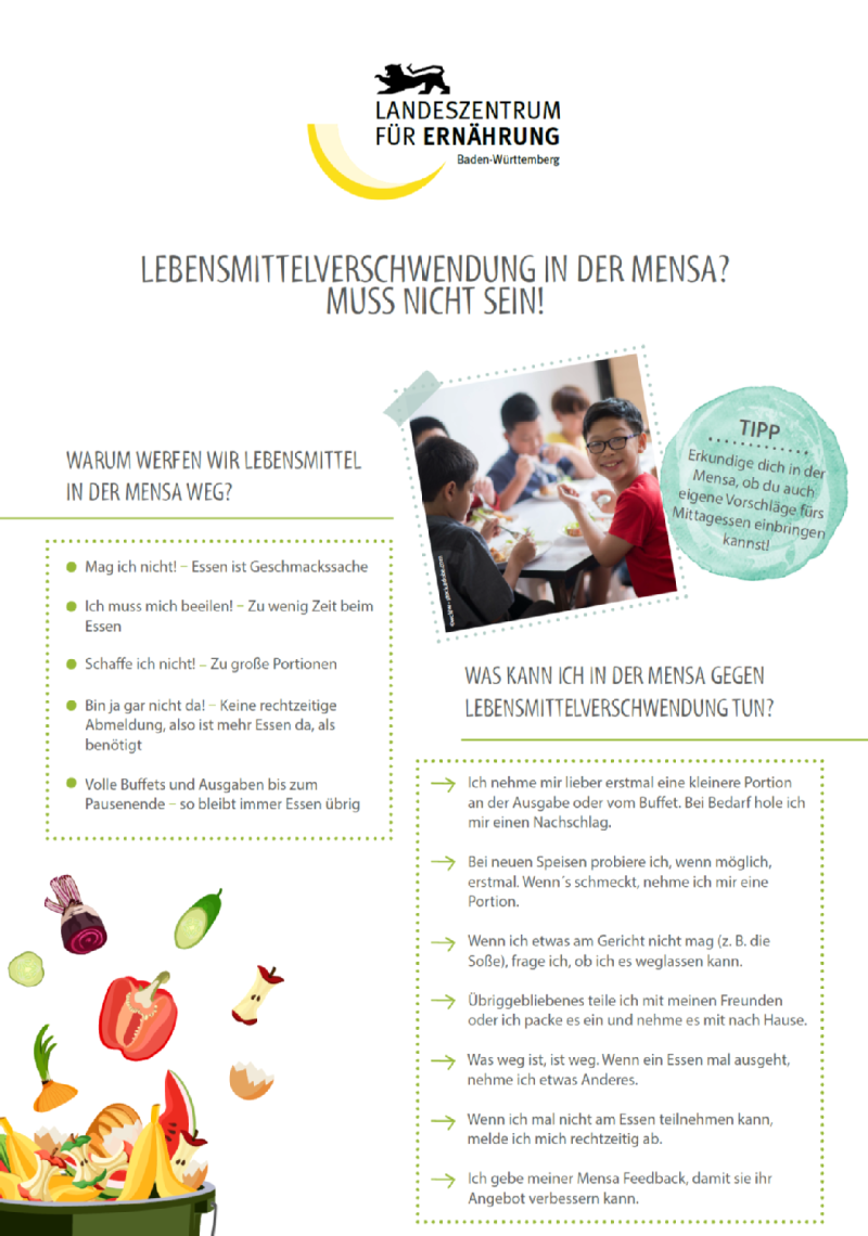 Das Plakat eignet sich für den Unterrichtseinsatz in der Sekundarstufe und liefert Tipps, um Lebensmittelverschwendung in der Mensa zu verhindern.