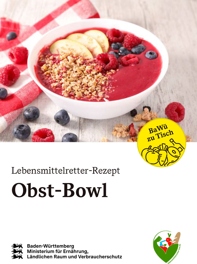Die Rezept-Postkarten zum Grundvorrat enthalten Rezepte, die mit Zutaten aus dem Lebensmittelvorrat zubereitet werden können. Das Rezept für die Obst-Bowl ist für 2 Personen konzipiert und richtet sich an Verbraucherinnen und Verbraucher.