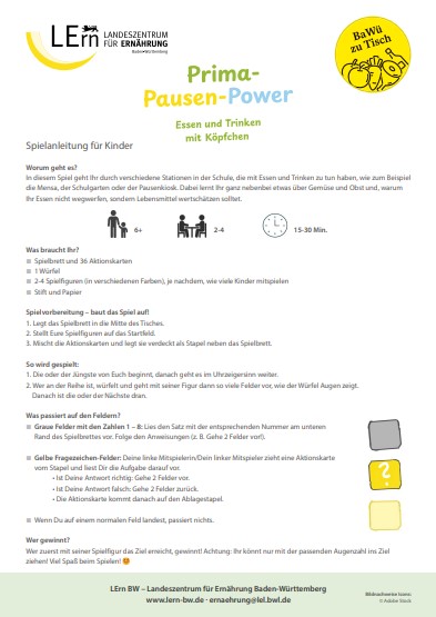 Die Anleitung gehört zum Brettspiel "Prima-Pausen-Power - Essen und Trinken mit Köpfchen“ für Grundschulkinder.