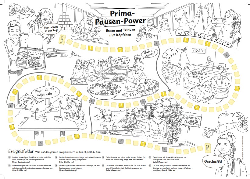 Diese Version des Spielbretts zum Ausmalen gehört zum Brettspiel "Prima-Pausen-Power - Essen und Trinken mit Köpfchen“ für Grundschulkinder.