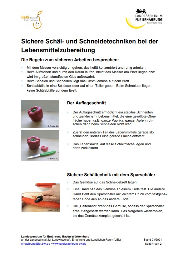 Wie die Zubereitung von Lebensmitteln mit Kindern sicher und ohne Verletzungsgefahr abläuft, zeigt die Anleitung zu den sicheren Schäl- und Schneidetechniken. Welche Techniken es gibt und wofür sie sich eignen, wird mit Hilfe von Bildern anschaulich erläutert. Die gemeinsame Lebensmittelzubereitung ist ein wertvoller Baustein der Ernährungsbildung. Nicht nur beim gemeinsamen Kochen mit der Familien, sondern auch beim pädagogischen Kochen in Kindertagespflege, Kita und Schule.