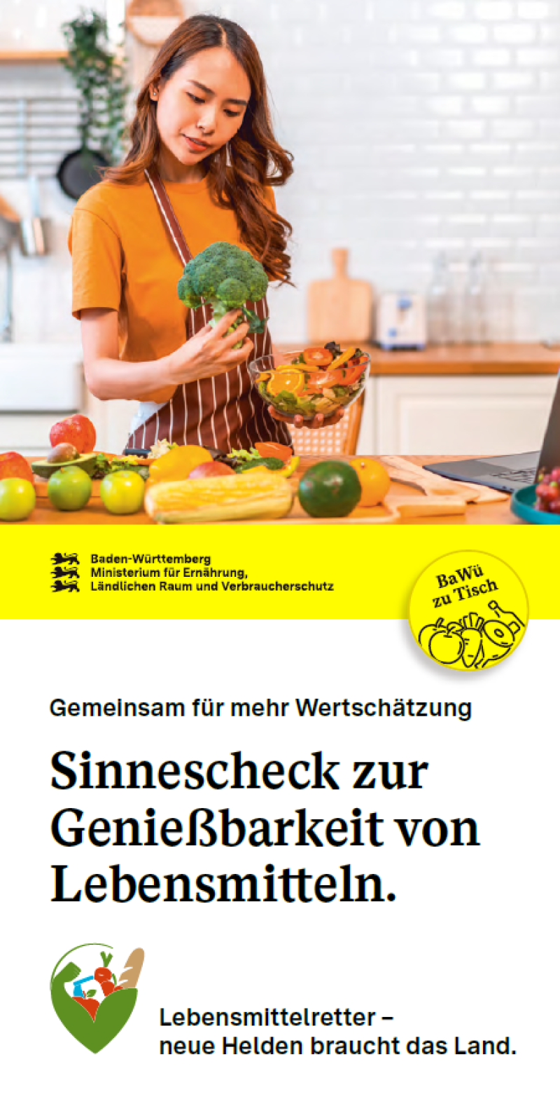 Der Flyer informiert Verbraucherinnen und Verbraucher darüber, wie die Genießbarkeit eines Lebensmittels mit Hilfe der eigenen Sinne beurteilt werden kann.