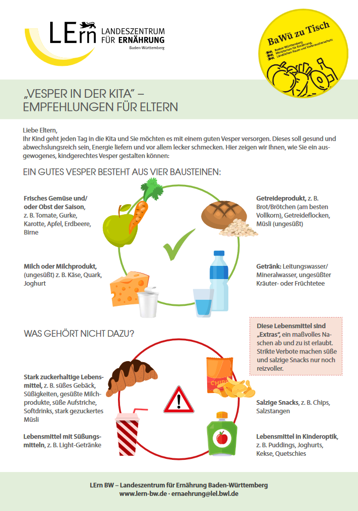 Das Infoblatt "Vesper in der Kita" richtet sich an Eltern und enthält die wichtigsten Infos, was zu einem kindgerechten Vesper gehört und was nicht geeignet ist.