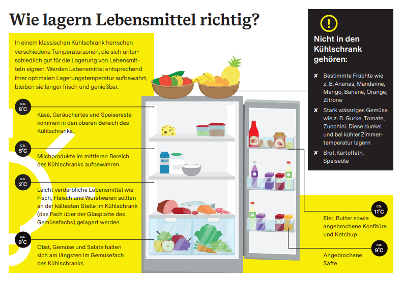 Der Flyer enthält Informationen darüber, welche Lebensmittel wo am besten im Kühlschrank gelagert werden und welche Lebensmittel nicht in den Kühlschrank gehören. Er enthält außerdem allgemeine Tipps zur Lagerung von Lebensmitteln. Der Flyer richtet sich an Verbraucherinnen und Verbraucher und soll für einen richtigen Umgang mit Lebensmitteln sensibilisieren, damit weniger Lebensmittelabfälle entstehen.