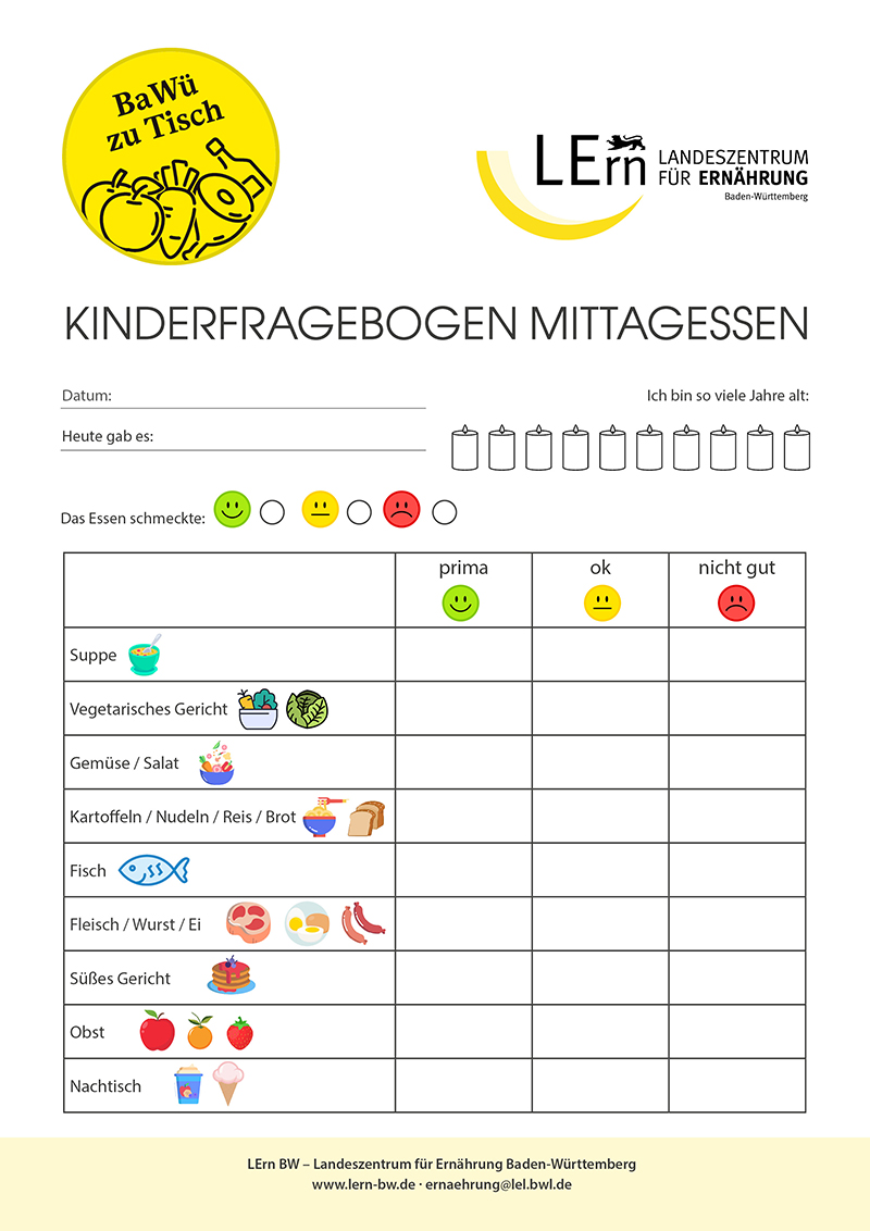 Wie schmeckt das Mittagessen in der Kita? Der Kinderfragebogen Mittagessen bietet Kindern die Chance das Mittagessen mitzugestalten.